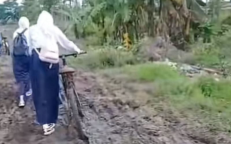 Ia menggambarkan kondisi jalan yang penuh genangan air, berlumpur, dan becek, yang sering kali menyulitkan warga, terutama para pelajar, untuk melintas dengan aman.