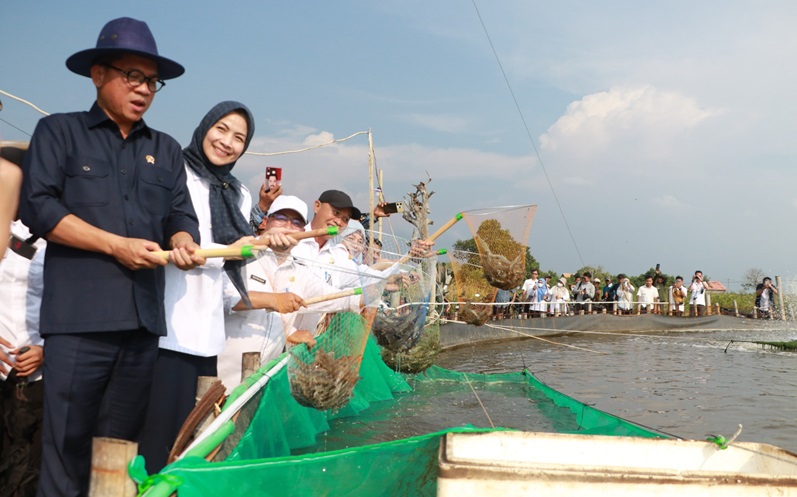 Mendes PDT Yandri Susanto juga menyampaikan apresiasi untuk Desa Domas yang telah melakukan panen udang vaname hasil dari bioflok sebagai salah satu program ketahanan pangan dari Kemendes PDT yang menggunakan dana desa.