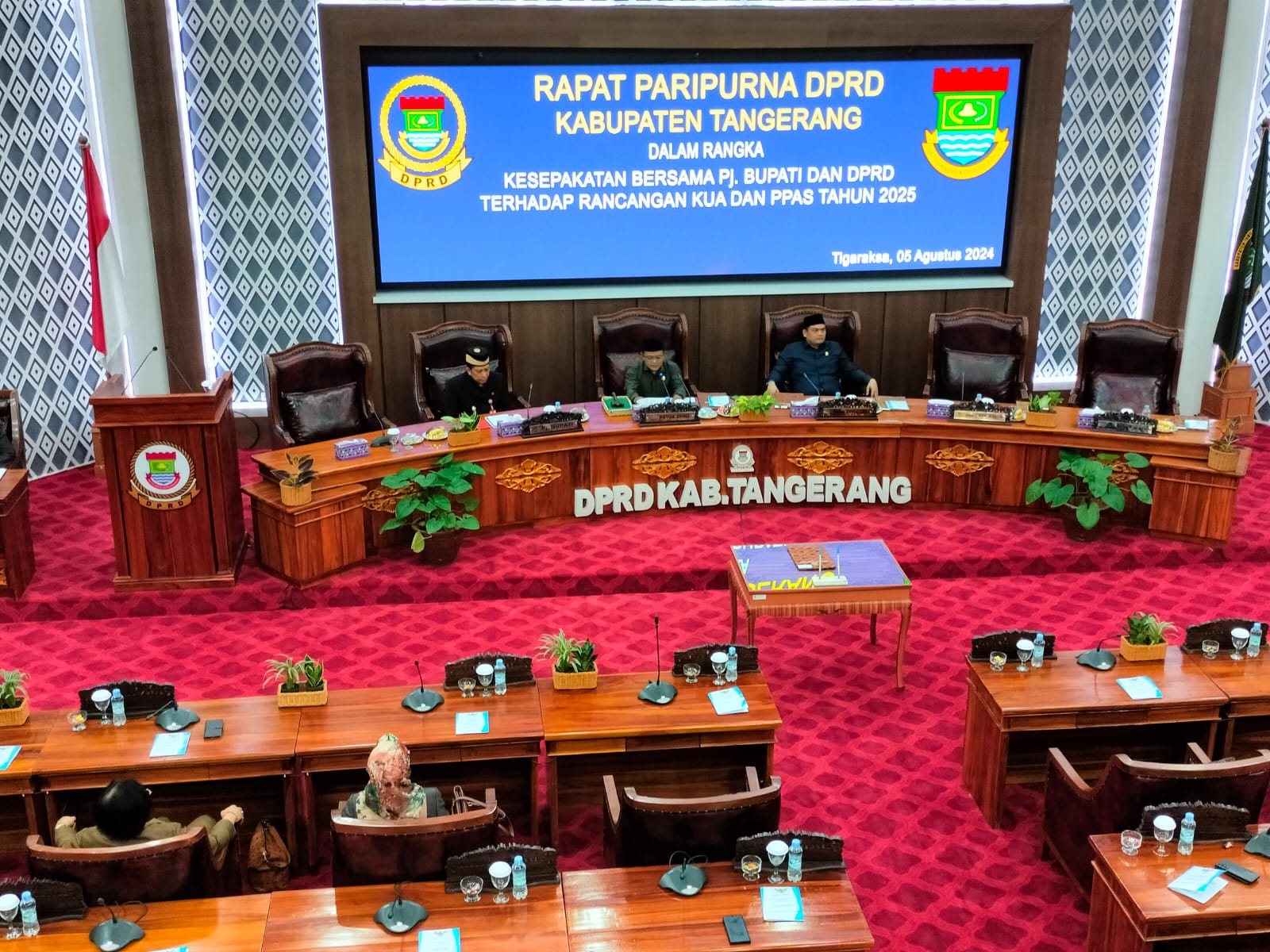 Beritabanten.com – Rapat Paripurna Dewan Perwakilan Rakyat Daerah (DPRD) Kabupaten Tangerang membahas kesepakatan bersama Pj Bupati dan DPRD tentang rancangan KUA dan PPAS 2025 digelar pada Senin 5 Agustus 2024.