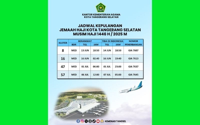 “Kloter JKG 8 yang merupakan Kloter pertama jemaah Tangsel menurut jadwal akan kembali ke tanah air pada Jumat, 13 Juni 2025 pukul 18.50 WAS dari Bandara Madinah, dan tiba di Bandara Soekarno-Hatta pada Sabtu, 14 Juni 2025 pukul 18.50 WIB,” dia jelaskan.