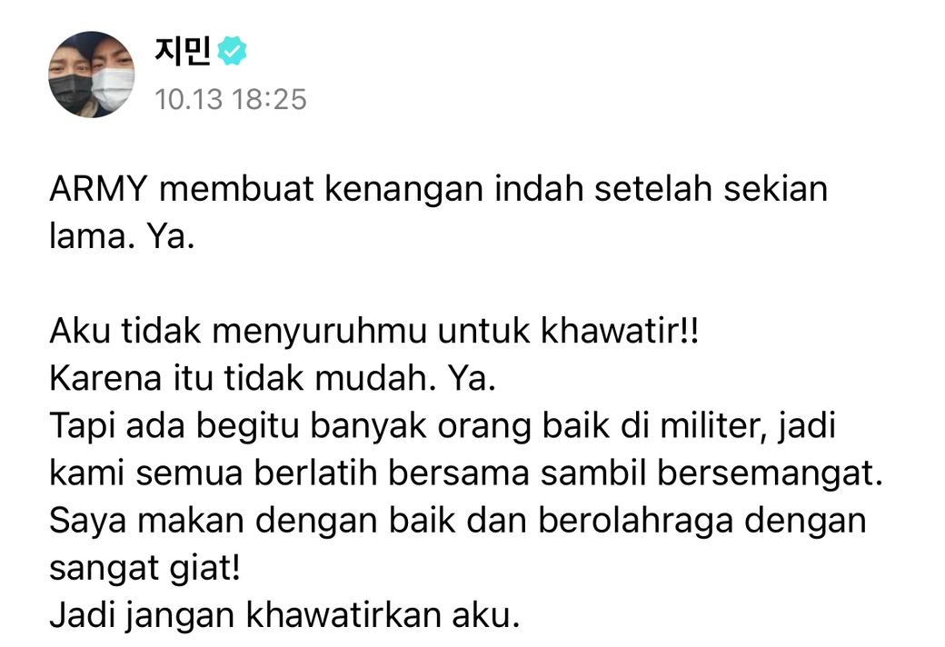 Unggahan Jimin itu pun disambut dengan antusias oleh ARMY di seluruh dunia, yang memenuhi kolom komentar dengan pesan-pesan penuh dukungan dan cinta.(sra)
