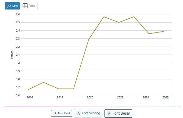 Namun dalam rentang waktu sepuluh tahun, justru terlihat peningkatan dari 1,67 persen hingga mencapai 2,39 persen pada 2025.
