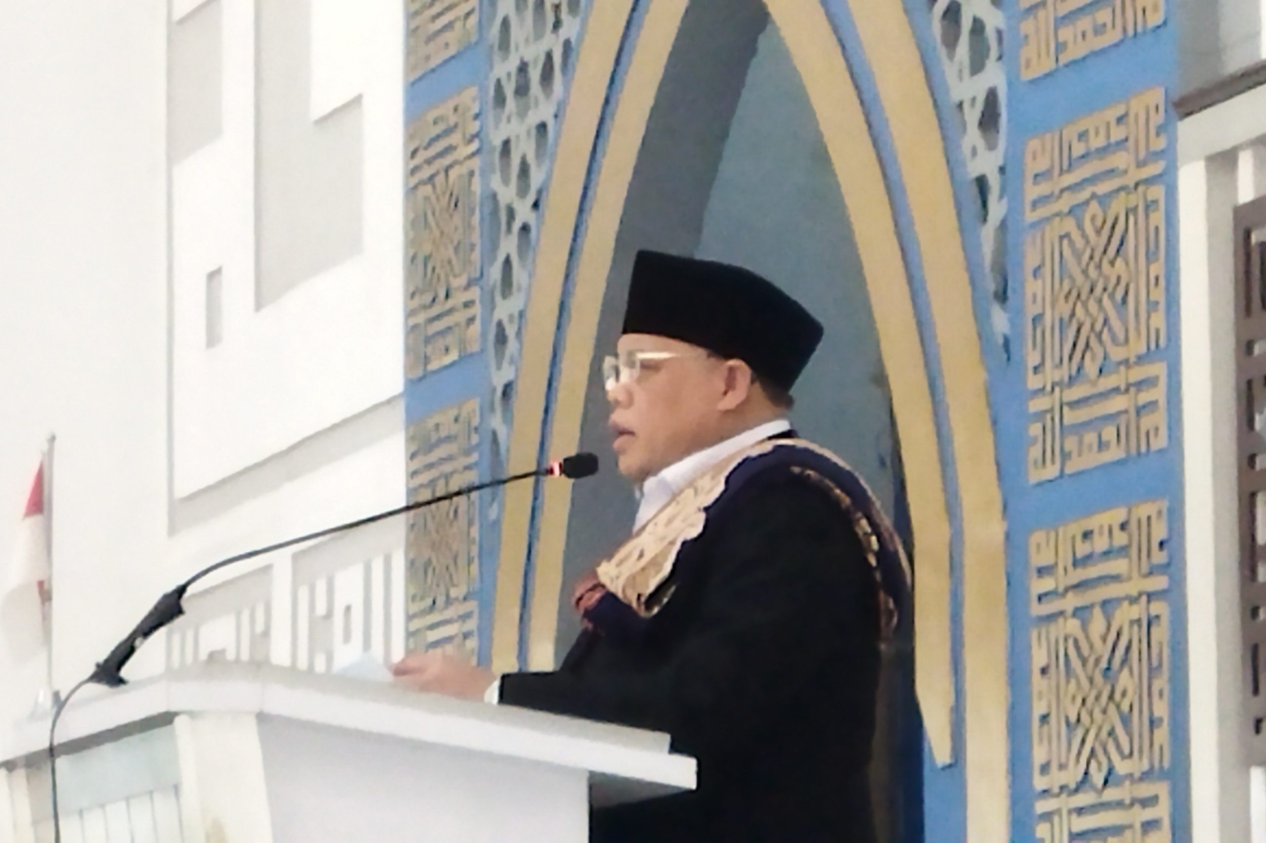 Suaranya menggema bacakan salam di depan Wakil Wali Kota Tangsel Pilar Saga Ichsan bersama jajaran dan para jemaah yang khusu mendengarkan khutbah.