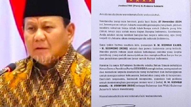 Surat yang menjadi perhatian publik ini memiliki kop gambar bintang empat dan mencantumkan nama serta tanda tangan Prabowo Subianto, yang berisi ajakan untuk mendukung pasangan calon Ridwan Kamil-Suswono pada Pilgub Jakarta 2024.