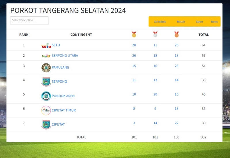 Sementara itu Pamulang harus bergeser di posisi ketiga dengan perolehan 15 emas, 18 perak dan 23 perunggu dengan pengumpulan jumlah medali sebanyak 54 keping.