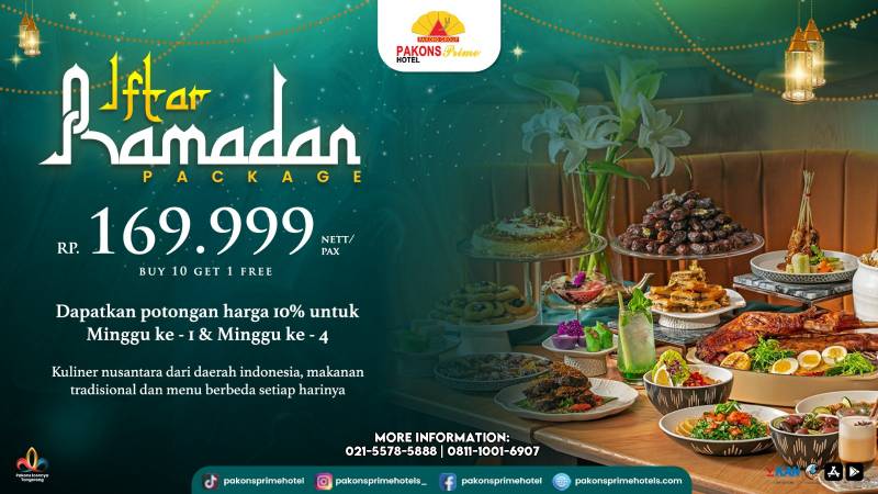 Kata dia, Iftar Ramadhan Pakons Prime Hotel ini hadir selama Ramadhan mulai pukul 17:00 – 21:00 WIB. Untuk Informasi dan keterangan lebih lanjut dapat menghubungi Pakons Prime Hotel 021 – 5578-5888 atau Marcom di no WA 0813-9945-9993 atau melalui DM instagram @pakonsorimehotels.