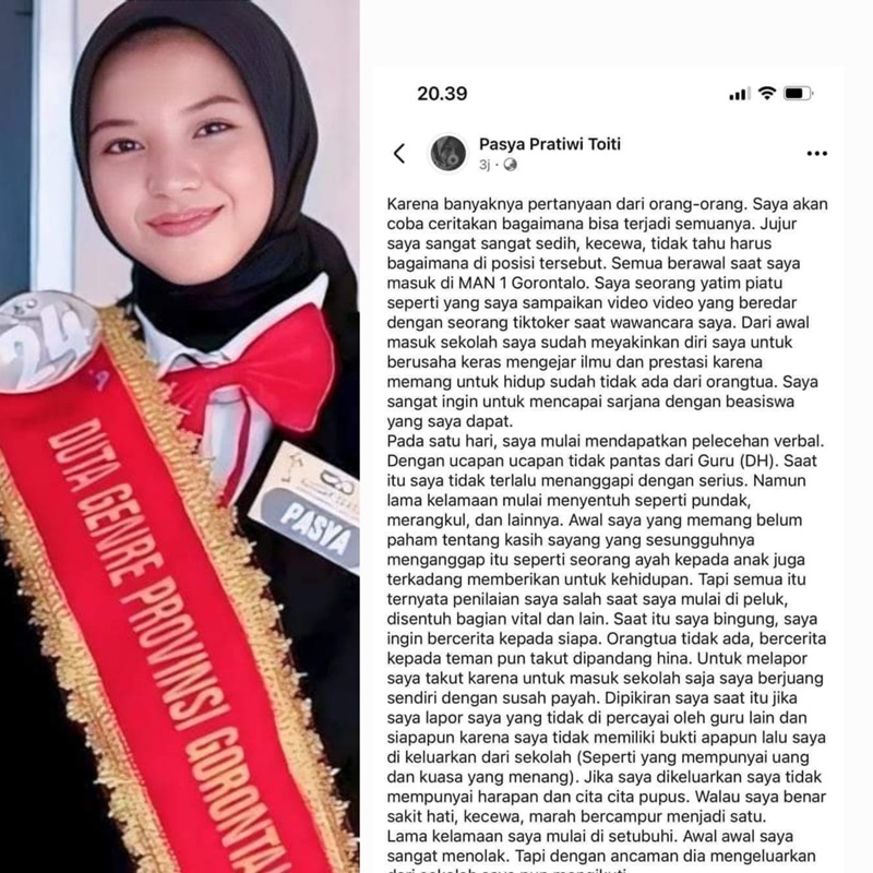 “Karena banyaknya pertanyaan dari berbagai pihak, saya akan mencoba menjelaskan bagaimana semuanya bisa terjadi. Sejujurnya, saya merasa sangat sedih, kecewa, dan bingung menghadapi situasi ini. Semuanya dimulai ketika saya masuk di MAN 1 Gorontalo. Sebagai seorang yatim piatu, seperti yang telah saya sampaikan dalam video-video yang beredar saat saya diwawancarai oleh seorang tiktoker. Sejak awal masuk sekolah, saya sudah bertekad untuk berusaha keras menimba ilmu dan meraih prestasi karena saya tidak lagi memiliki dukungan dari orang tua,” tulisnya di awal pernyataan, Selasa (1/10/2024)